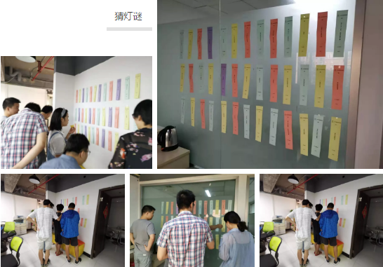 猜燈謎活動在子公司逸趣舉行,燈謎張貼在會議室外墻,猜對3個燈謎的小伙伴即可抽獎,中獎率為99.9999%。